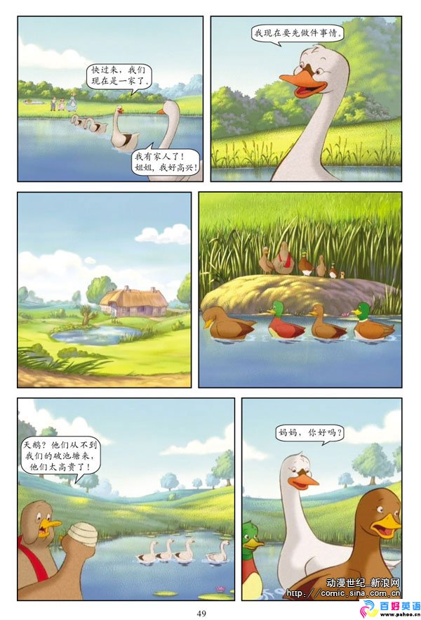 “我要飞向他们,飞向这些高贵的鸟儿!可是他们会把我劈碎的,因为我是这样丑,居然敢接近他们。不过这没有什么关系!被他们杀死,要比被鸭子咬、被鸡群啄,被看管养鸡场的那个女佣人踢和在冬天受苦好得多!”于是他飞到水里,向这些高贵优雅的天鹅游去:这些动物看到他,马上就竖起羽毛向他游来。“请你们弄死我吧!”这只可怜的家伙说。他把头低低地垂到水上,只等待着死。但是他在这清澈的水上看到了什么呢?他看到了自己的倒影。但那不再是一只粗笨的、深灰色的、又丑又令人讨厌的鸭子,而却是--一只天鹅!